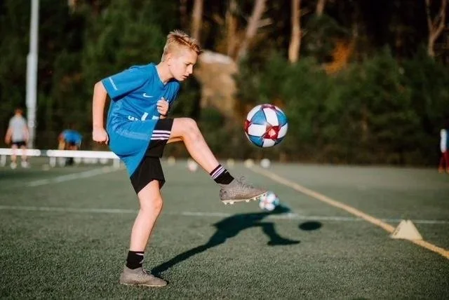 Young boy practicing soccer on a field during daylight, kicking a soccer ball with trees in the background.